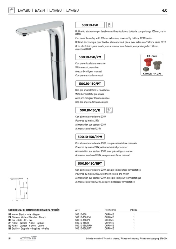 Robinet électronique pour lavabo, alimentation à piles, avec extension 150mm, série OTTO