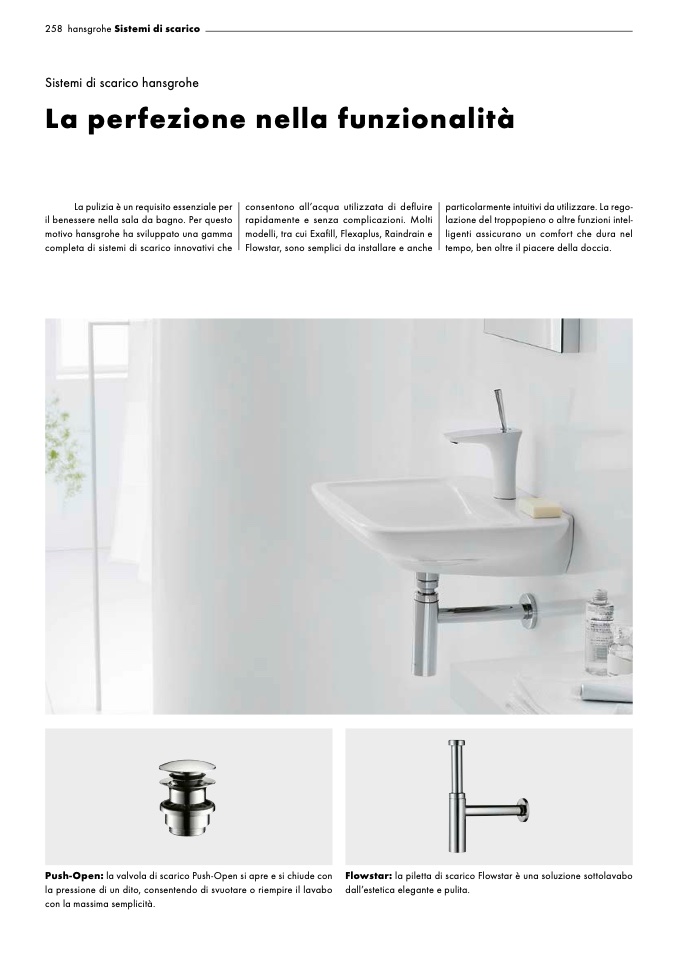 Push-Open: la valvola di scarico Push-Open si apre e si chiude con Flowstar: la piletta di scarico Flowstar è una soluzione sottolavabo