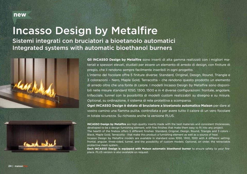 Each INCASSO Design is equipped with Maison automatic bioethanol burner to ensure safety to your