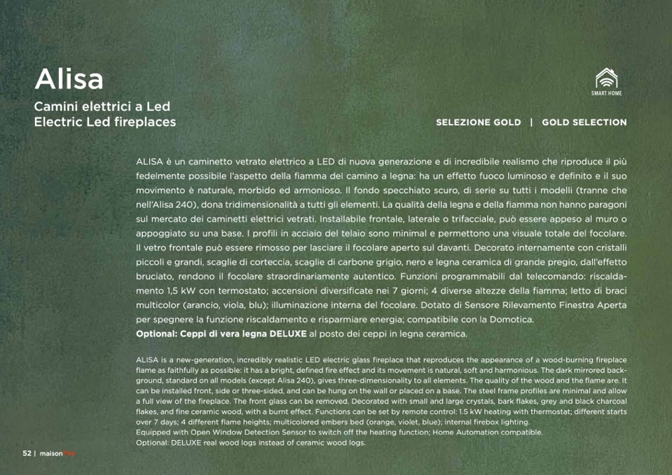 ALISA is a new-generation, incredibly realistic LED electric glass fireplace that reproduces the appearance of a wood-burning
