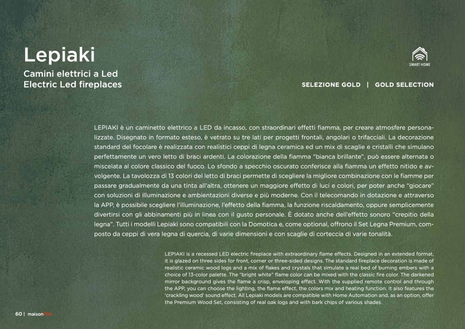 ‘crackling wood’ sound effect. All Lepiaki models are compatible with Home Automation and, as an option, offer