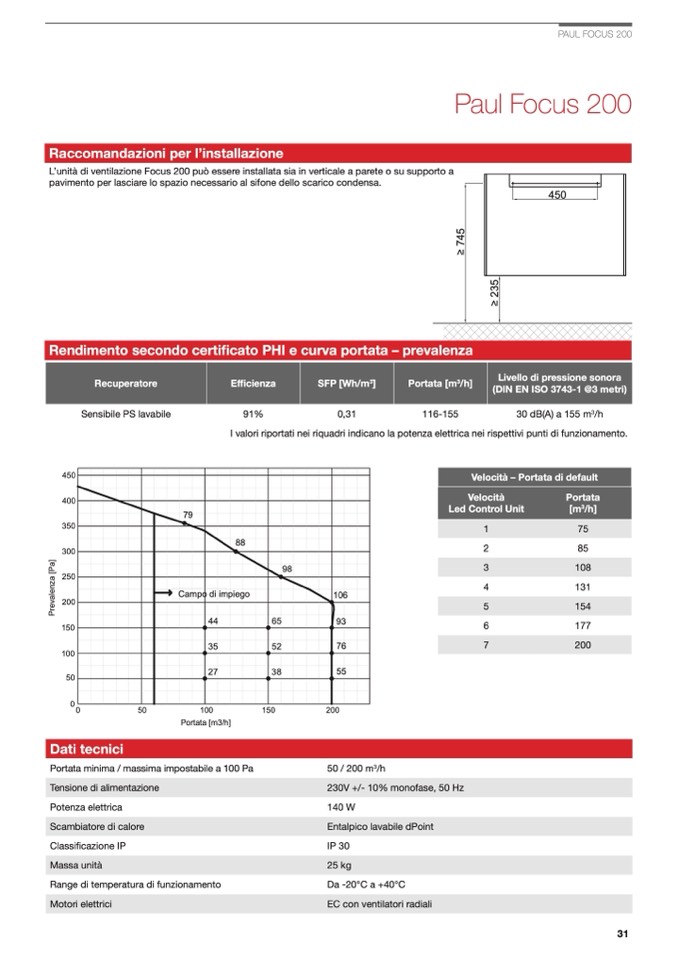 L’unità di ventilazione Focus 200 può essere installata sia in verticale a parete o su supporto a