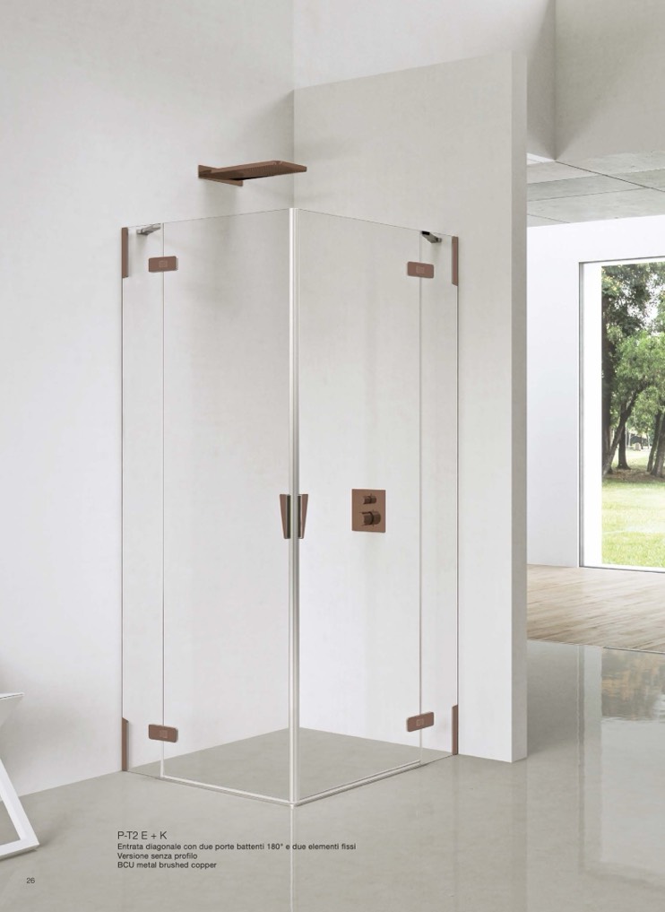 Entrata diagonale con due porte battenti 180° e due elementi fissi