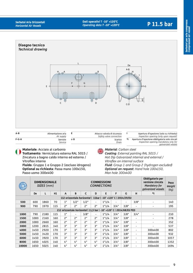 212 orizzontale horizontal | 11,5 bar | -10° +120° C | 2014/68/EU PED
