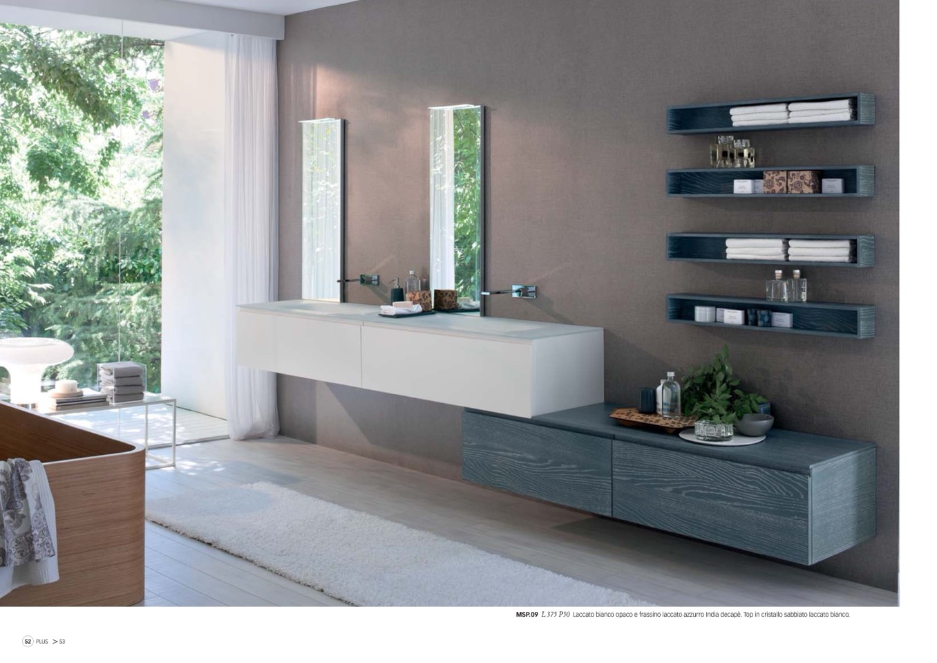 MSP.09 L 375 P50 Laccato bianco opaco e frassino laccato azzurro India decapè. Top in cristallo sabbiato laccato bianco.