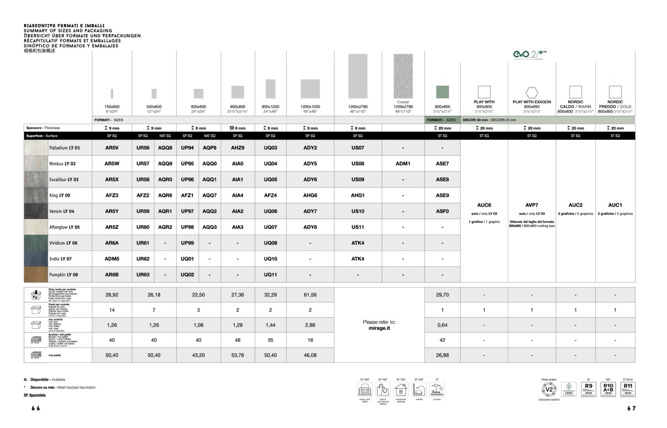 Summary of sizes and packaging