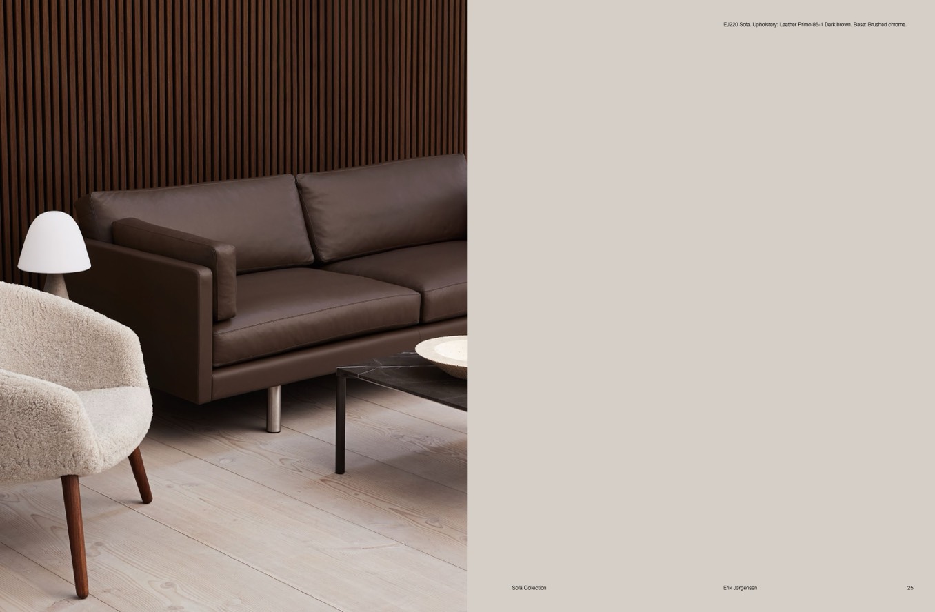 EJ220 Sofa. Upholstery: Leather Primo 86-1 Dark brown. Base: Brushed chrome.