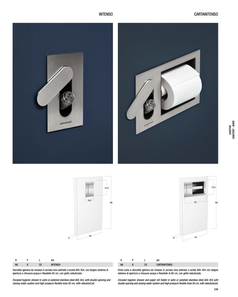Porta carta e doccetta igienica da incasso in acciaio inox satinato o lucido AISI 304 con doppio