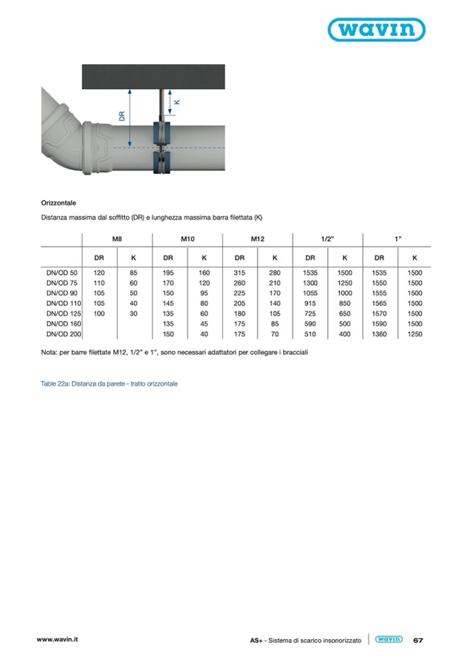 Distanza massima dal soffitto (DR) e lunghezza massima barra filettata (K)