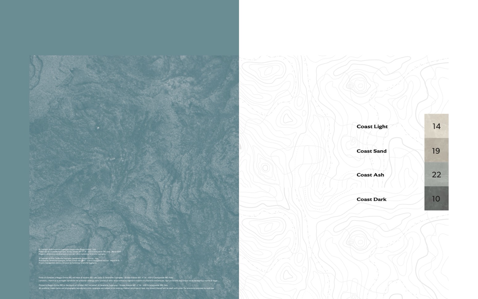 Printed in Reggio Emilia (RE) in the month of October 2021 on behalf of Ceramiche Supergres - Strada Statale 467, n° 34 - 42013 Casalgrande (RE) Italy