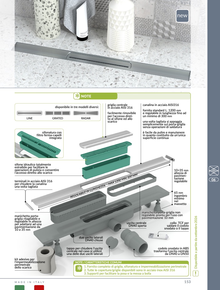 1. Fornito completo di griglia, sifonatura e impermeabilizzazione perimetral