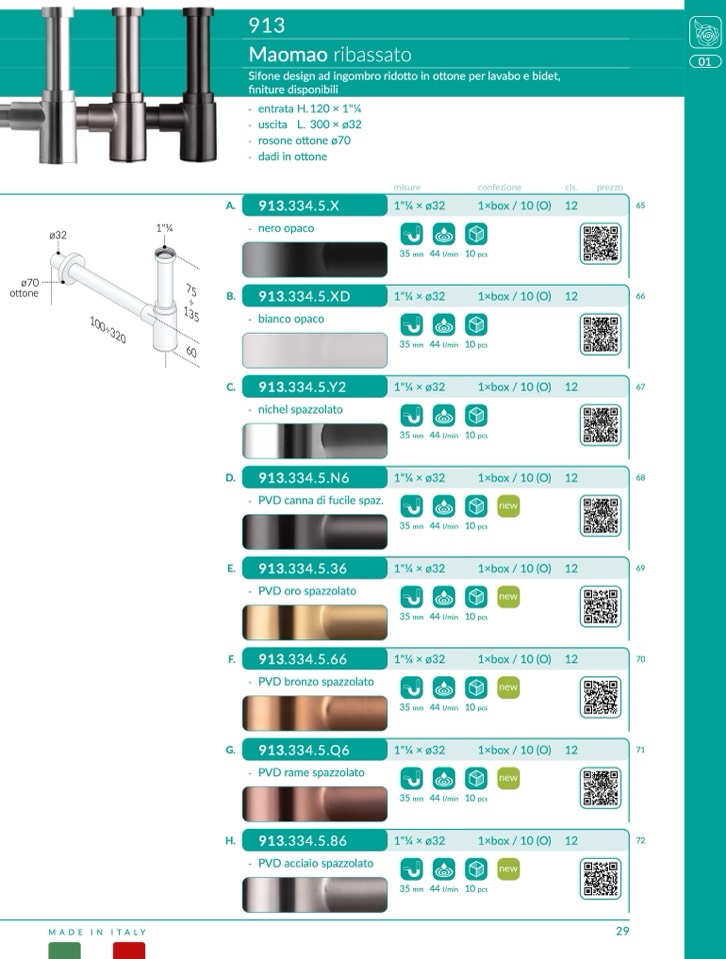 Sifone design ad ingombro ridotto in ottone per lavabo e bidet