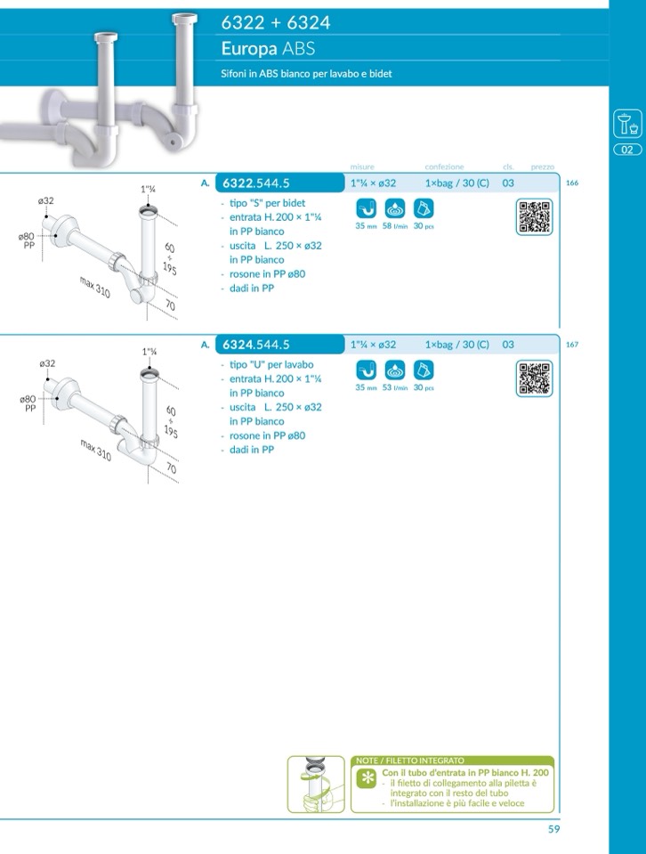 Sifoni in ABS bianco per lavabo e bidet