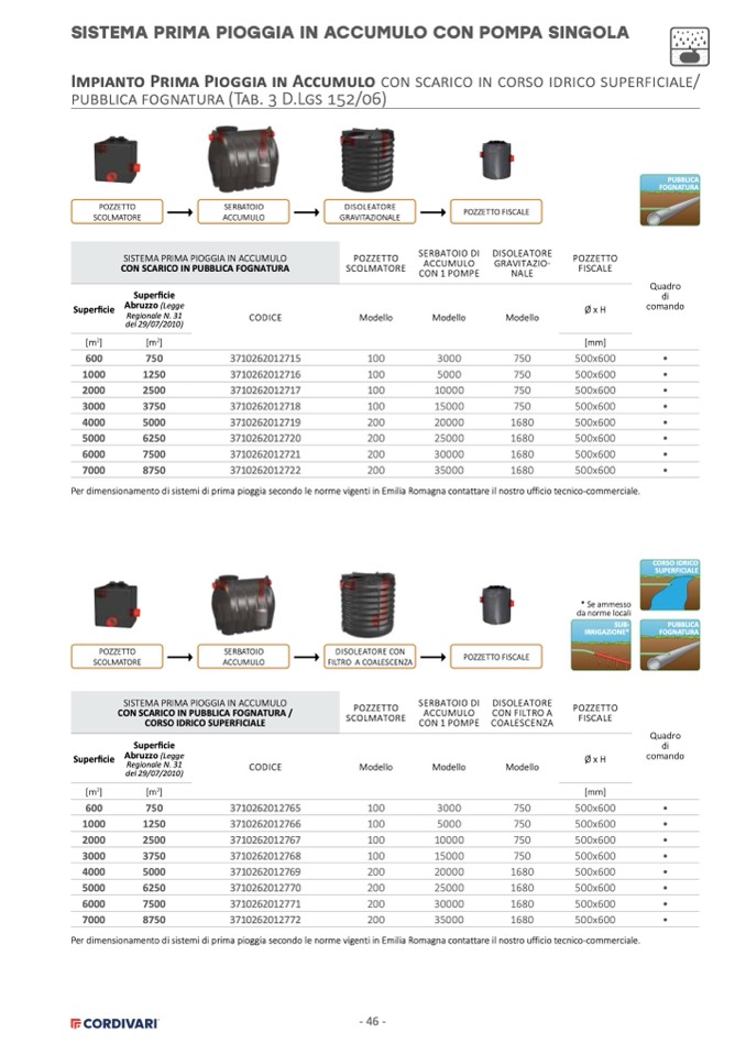 Per dimensionamento di sistemi di prima pioggia secondo le norme vigenti in Emilia Romagna contattare il nostro ufficio tecnico-commerciale.