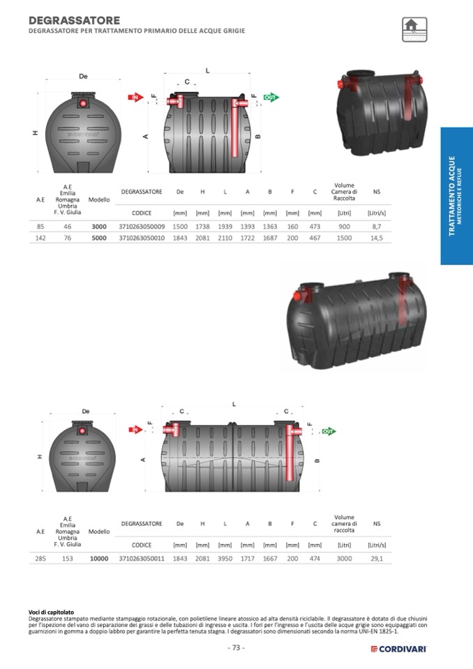 guarnizioni in gomma a doppio labbro per garantire la perfetta tenuta stagna. I degrassatori sono dimensionati secondo la norma UNI-EN 1825-1.