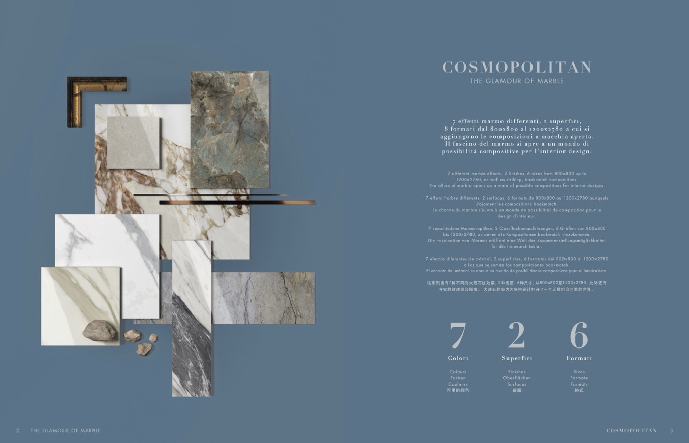 该系列备有7种不同的大理石纹效果,2种表面,6种尺寸,从800x800至1200x2780,此外还有