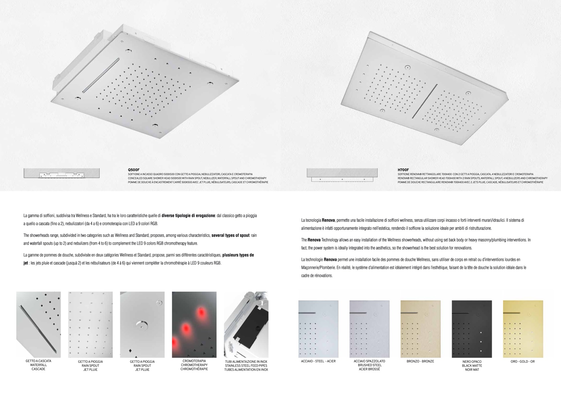 La gamma di soffioni, suddivisa tra Wellness e Standard, ha tra le loro caratteristiche quelle di diverse tipologie di erogazione: dal classico getto a pioggia
