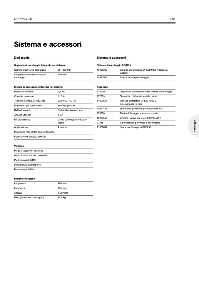 Sistema di carotaggio DRS250/230 V (piede a