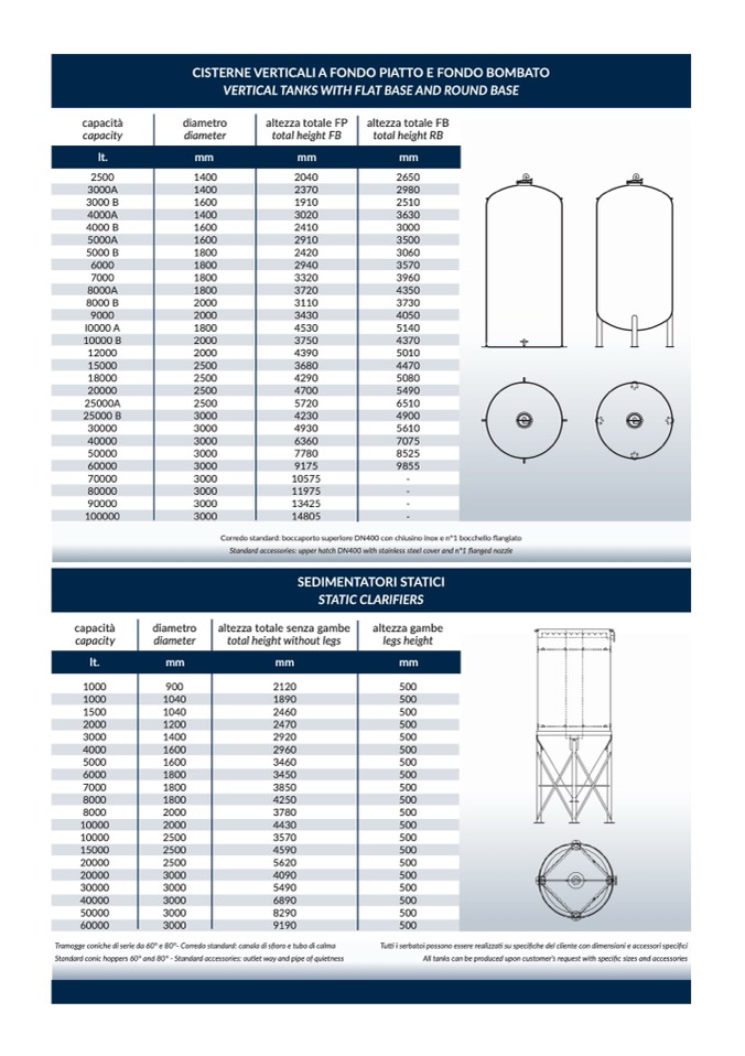 Tutti i serbatoi possono essere realizzati su specifiche del cliente con dimensioni e accessori specifici