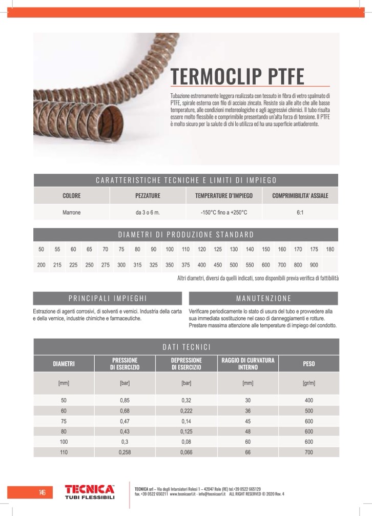 PTFE, spirale esterna con filo di acciaio zincato. Resiste sia alle alte che alle basse