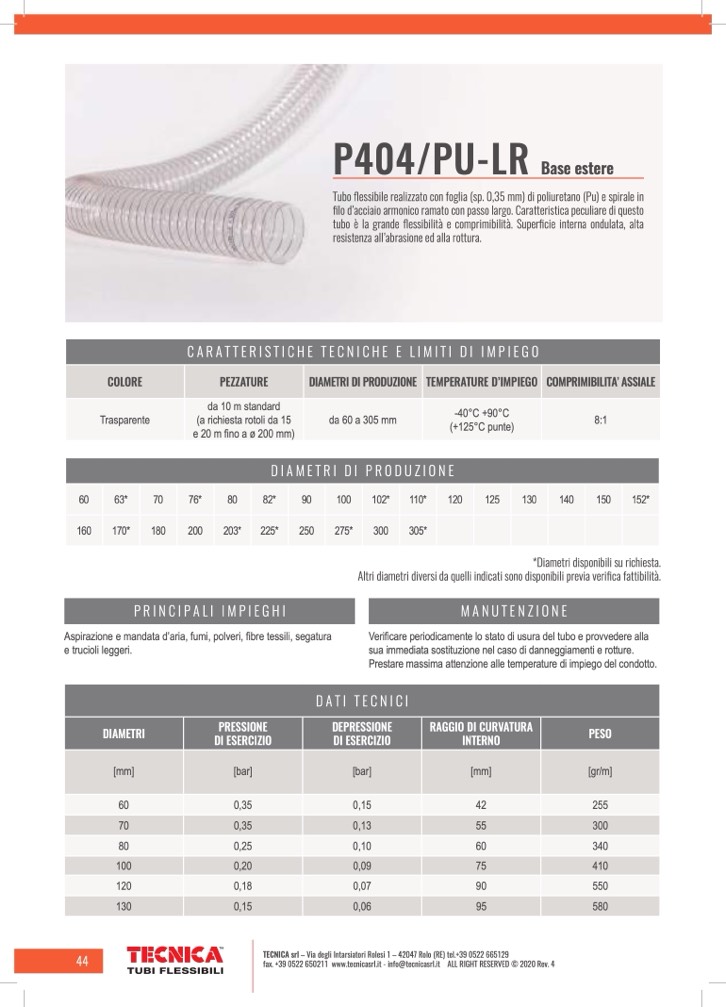 Tubo flessibile realizzato con foglia (sp. 0,35 mm) di poliuretano (Pu) e spirale in