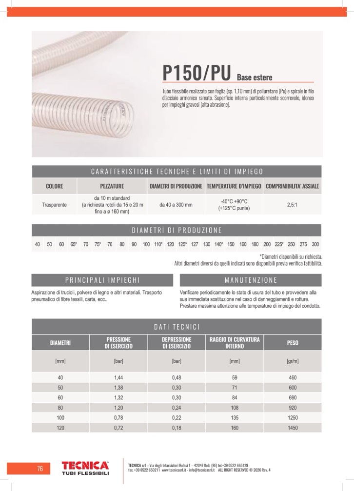 Tubo flessibile realizzato con foglia (sp. 1,10 mm) di poliuretano (Pu) e spirale in filo