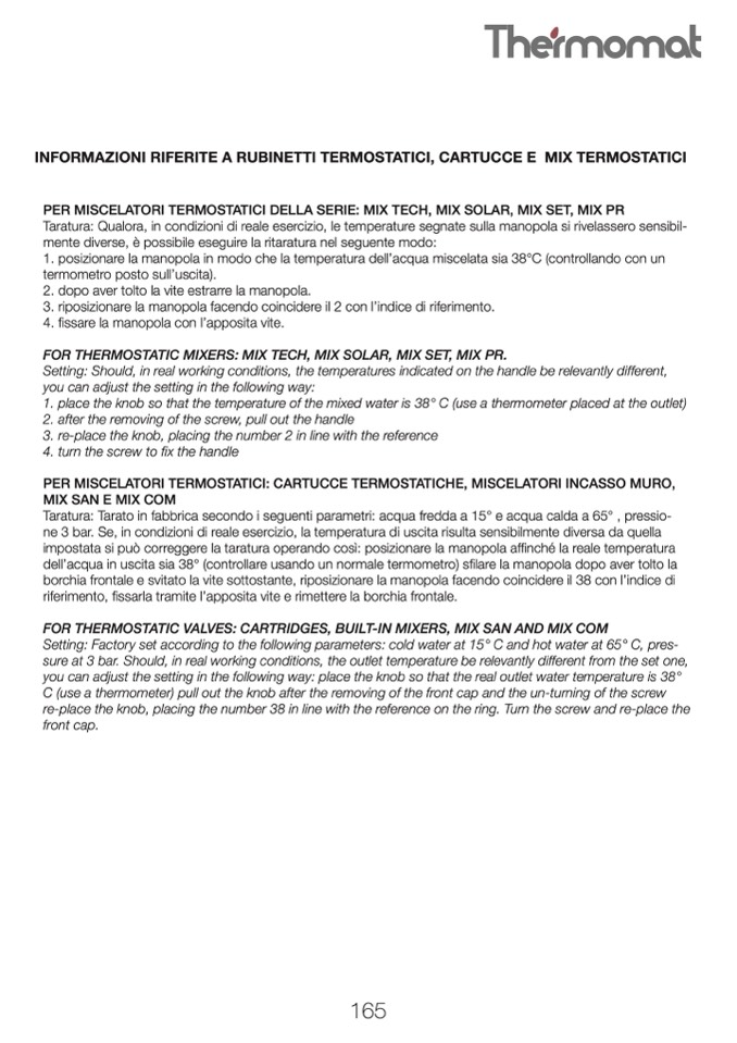 FOR THERMOSTATIC MIXERS: MIX TECH, MIX SOLAR, MIX SET, MIX PR.