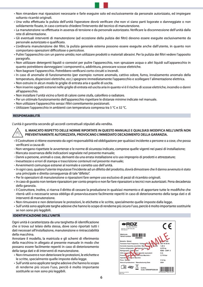 IL MANCATO RISPETTO DELLE NORME RIPORTATE IN QUESTO MANUALE E QUALSIASI MODIFICA NELL’UNITÀ NON