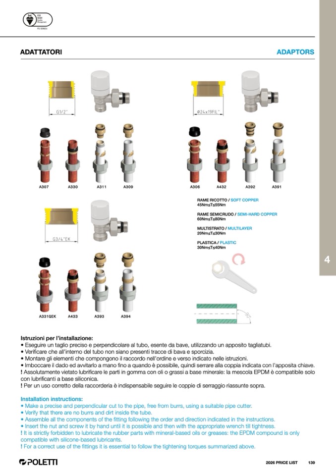 ! Per un uso corretto della raccorderia è indispensabile seguire le coppie di serraggio riassunte sopra.