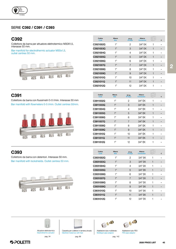 Bar manifold with lockshields. Outlet centres 50 mm.