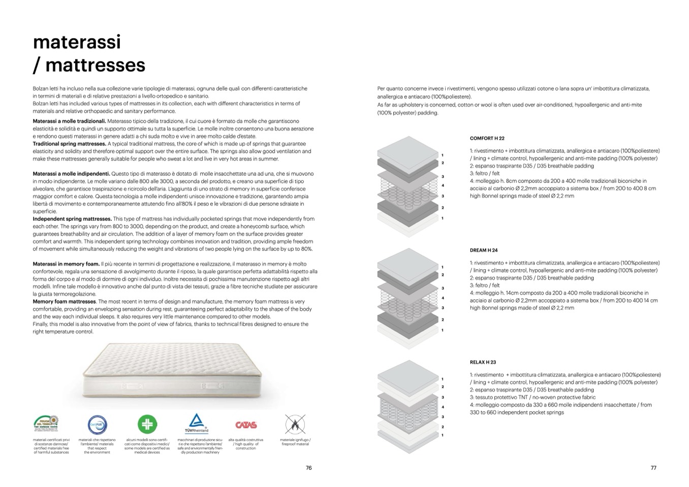 Bolzan letti has included various types of mattresses in its collection, each with different characteristics in terms of