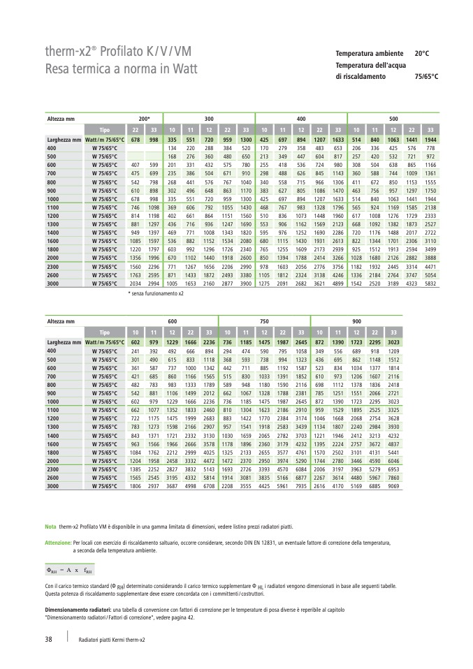 Con il carico termico standard (Φ RH) determinato considerando il carico termico supplementare Φ HL i radiatori vengono dimensionati in base alle seguenti tabelle.
