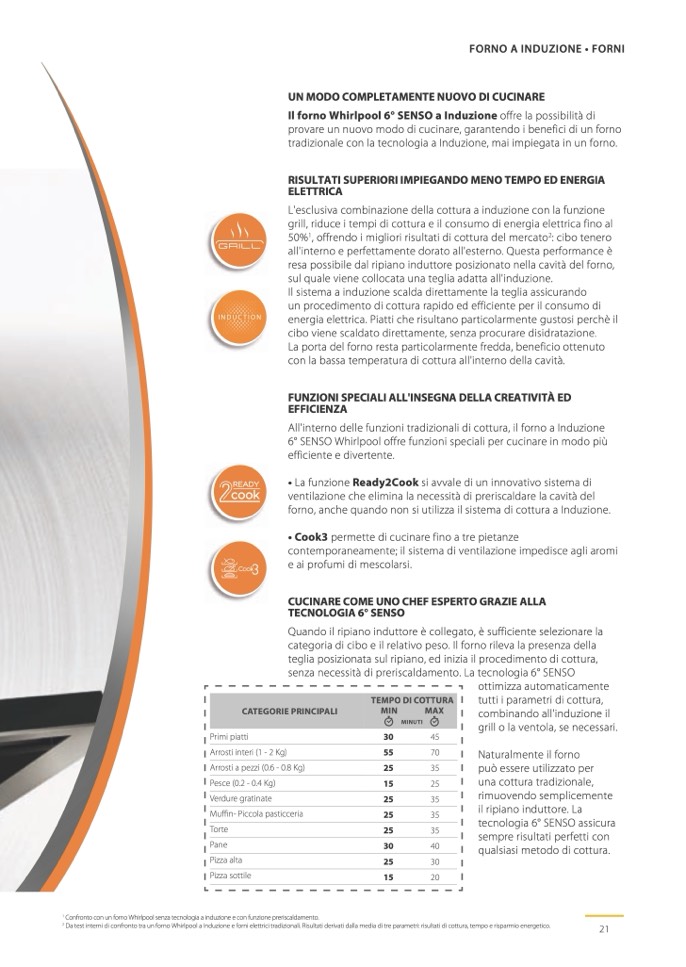 Da test interni di confronto tra un forno Whirlpool a Induzione e forni elettrici tradizionali. Risultati derivati dalla media di tre parametri: risultati di cottura, tempo e risparmio energetico.