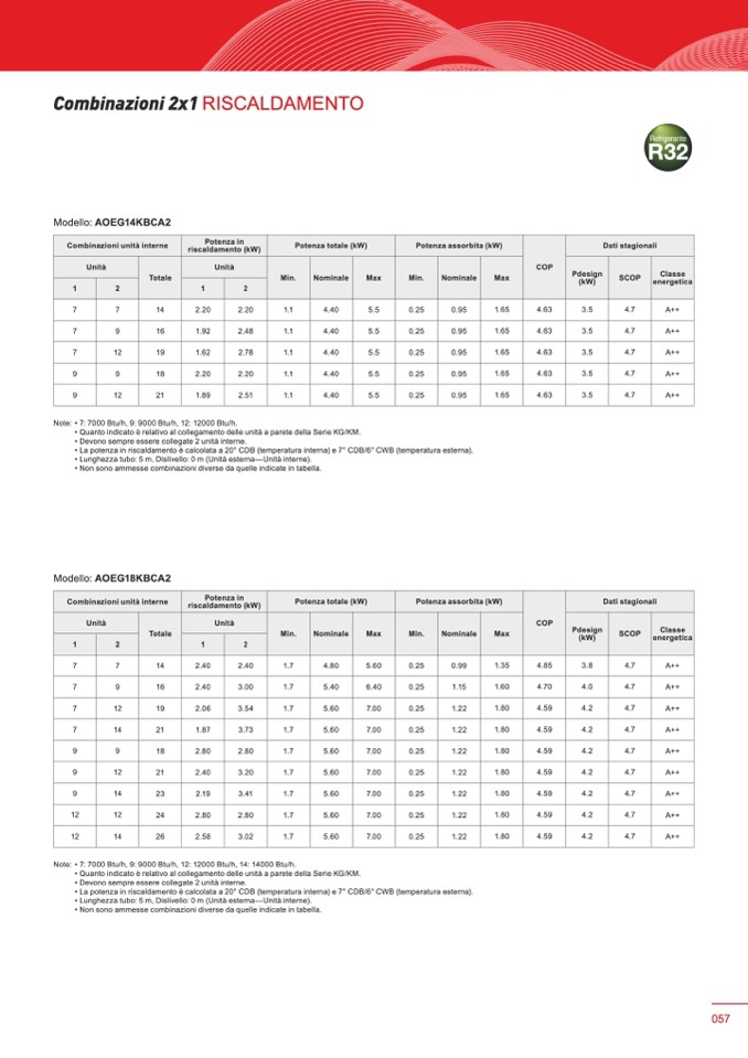 • La potenza in riscaldamento è calcolata a 20° CDB (temperatura interna) e 7° CDB/6° CWB (temperatura esterna).