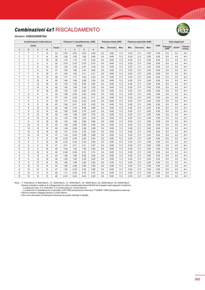 - La potenza in riscaldamento è calcolata a 20°CDB (temperatura interna) e 7°CDB/6° CWB (temperatura esterna).