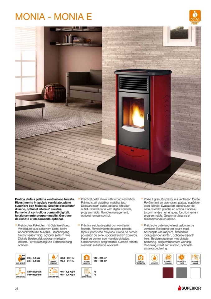 Practical pellet stove with forced ventilation.