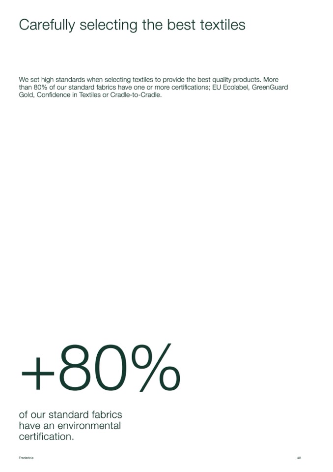 than 80% of our standard fabrics have one or more certifications; EU Ecolabel, GreenGuard