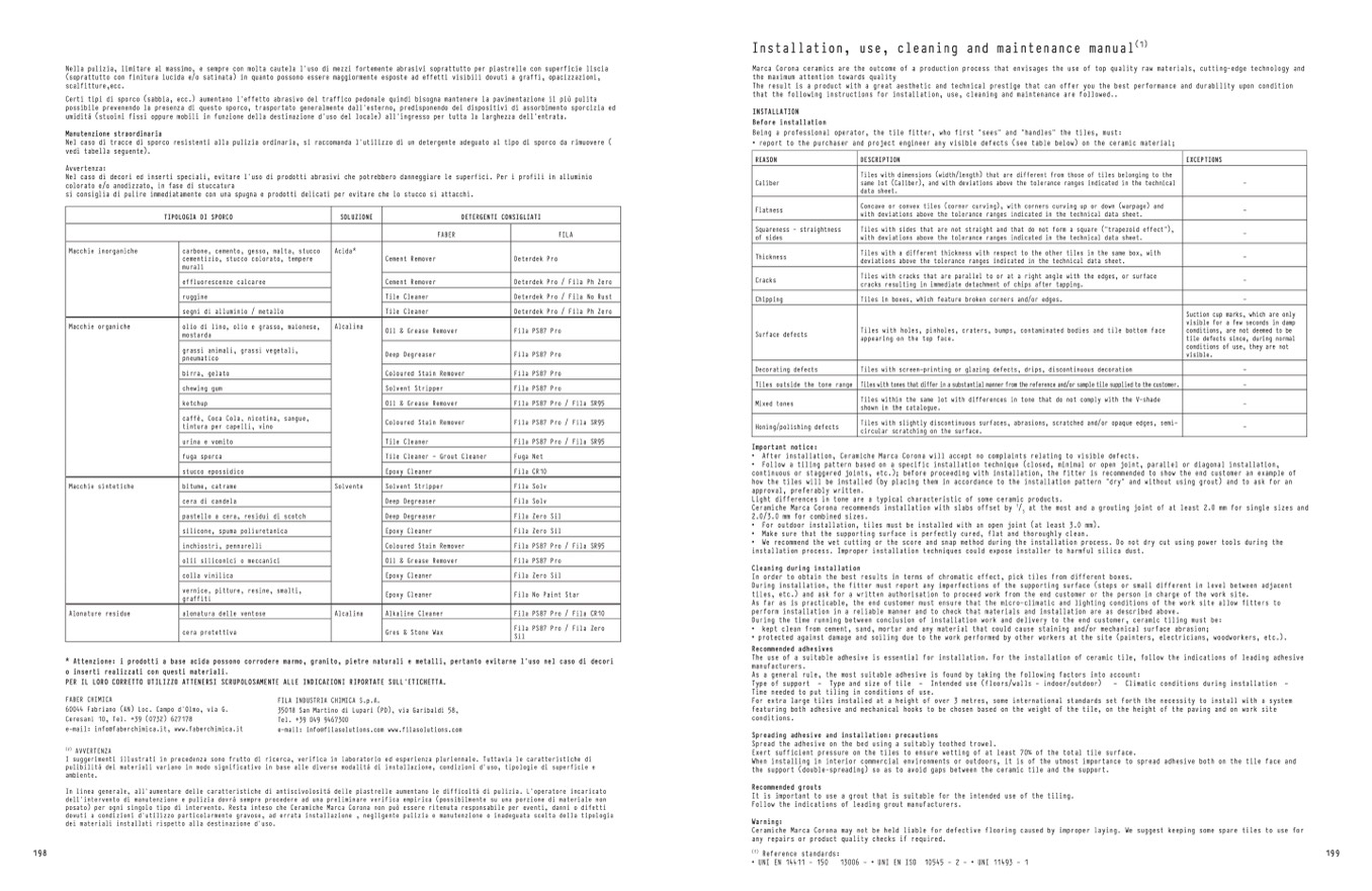 • After installation, Ceramiche Marca Corona will accept no complaints relating to visible defects.