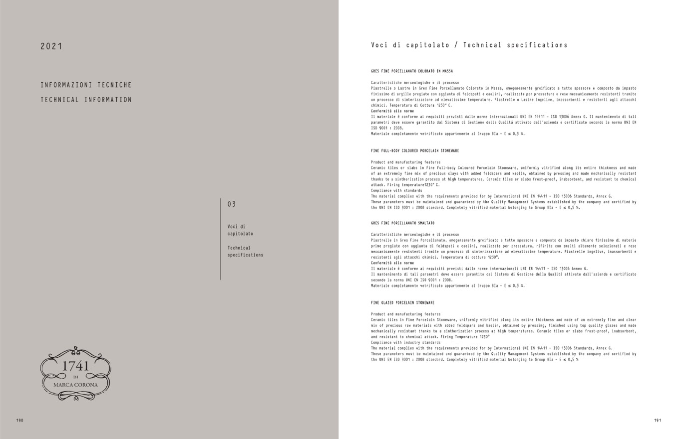 the UNI EN ISO 9001 : 2008 standard. Completely vitrified material belonging to Group BIa – E 0,5 %.