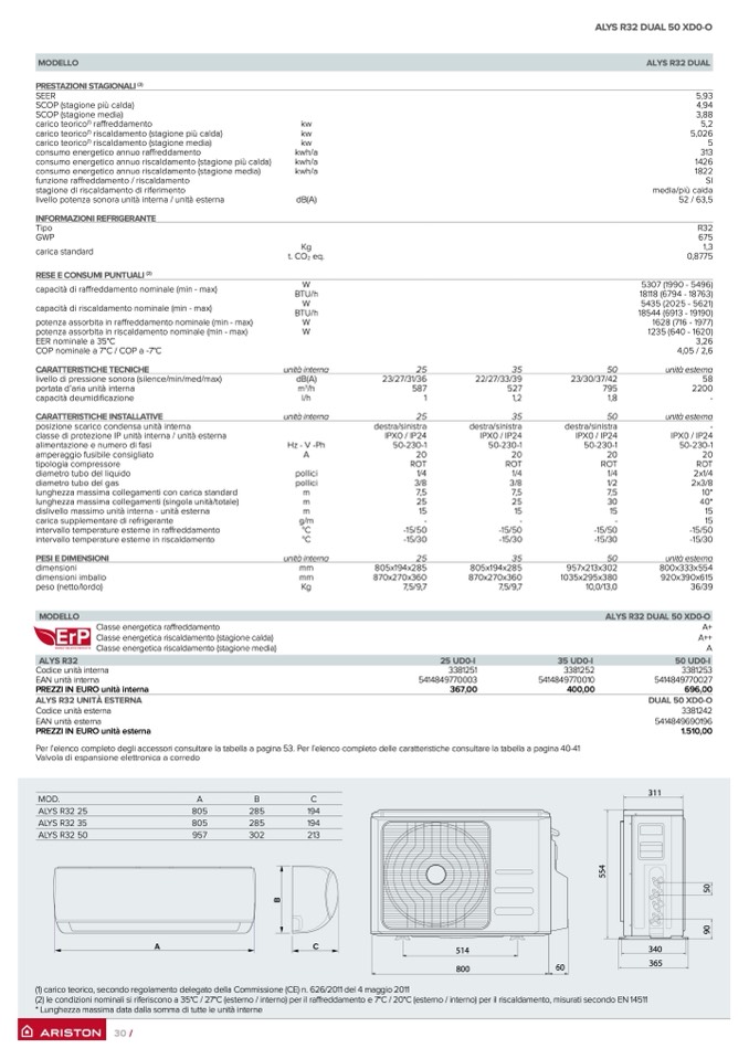 (2) le condizioni nominali si riferiscono a 35°C / 27°C (esterno / interno) per il raffreddamento e 7°C / 20°C (esterno / interno) per il riscaldamento, misurati secondo EN 14511