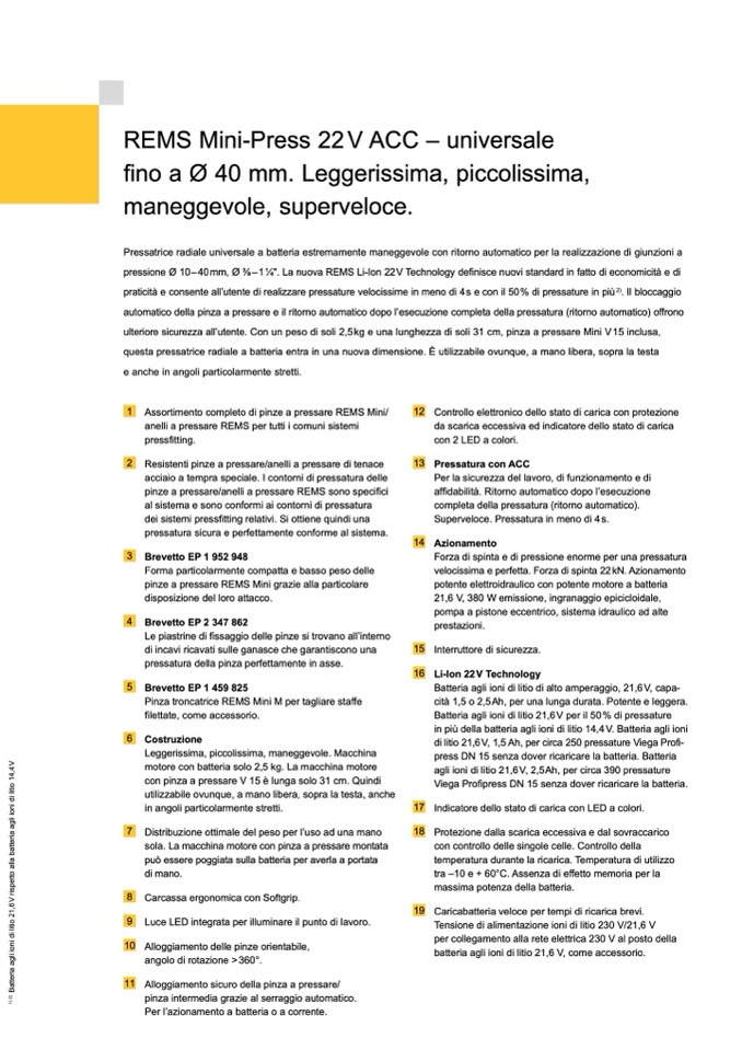 pressione Ø 10–40mm, Ø 3⁄8–11⁄4". La nuova REMS Li-Ion 22V Technology definisce nuovi standard in fatto di economicità e di
