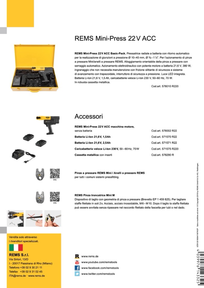 REMS Mini-Press 22 V ACC Basic-Pack. Pressatrice radiale a batteria con ritorno automatico