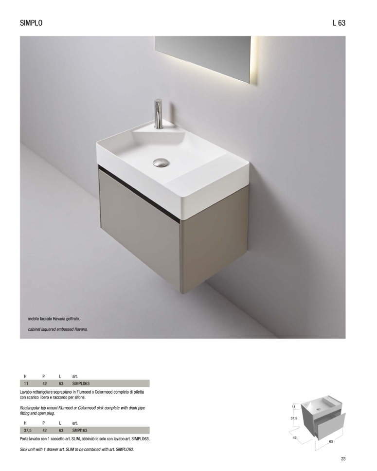 Porta lavabo con 1 cassetto art. SLIM, abbinabile solo con lavabo art. SIMPLO63.