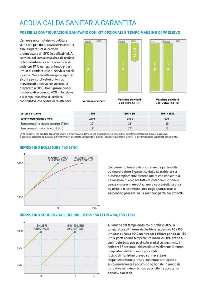 Tempi misurati con bollitore preparato a 50°C e prelievo ACS a 40°C, senza attivazione della PdC o della resistenza integrativa durante il prelievo.