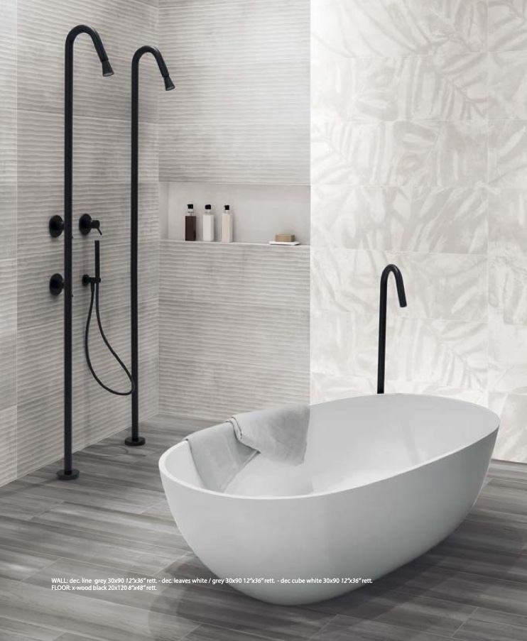 WALL: dec. line grey 30x90 12”x36” rett. - dec. leaves white / grey 30x90 12”x36” rett. - dec cube white 30x90 12”x36” rett.
