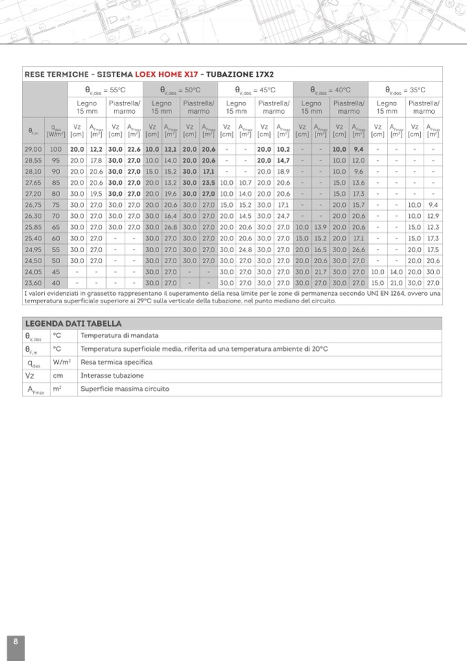 I valori evidenziati in grassetto rappresentano il superamento della resa limite per le zone di permanenza secondo UNI EN 1264, ovvero una