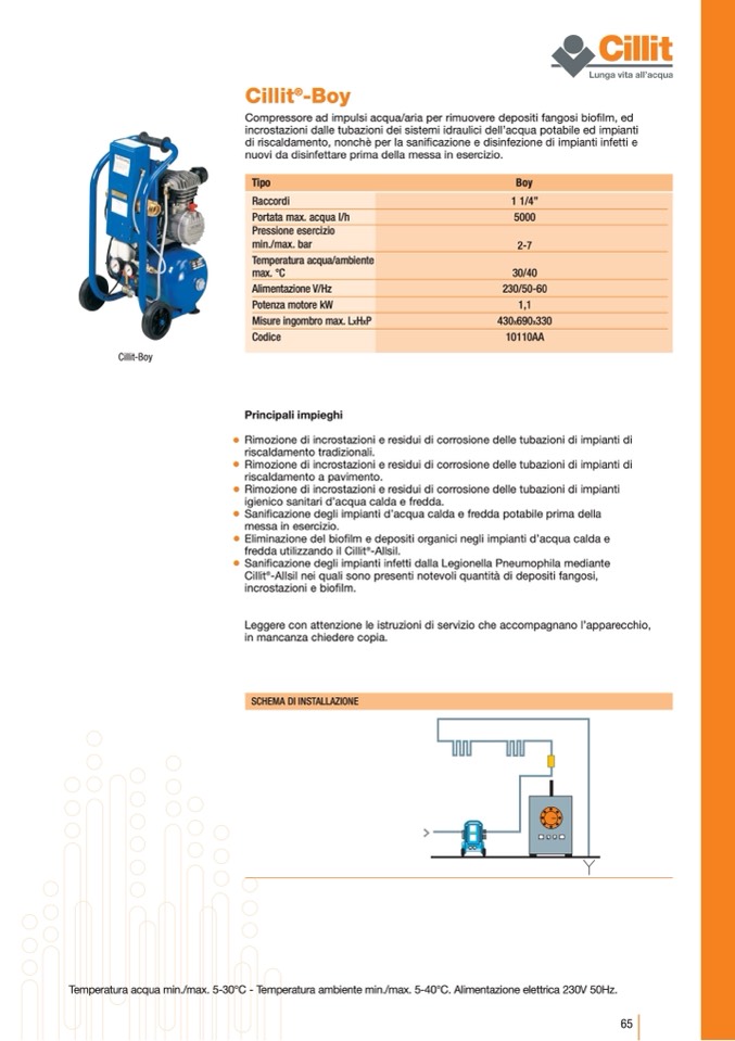 Temperatura acqua min./max. 5-30°C - Temperatura ambiente min./max. 5-40°C. Alimentazione elettrica 230V 50Hz.