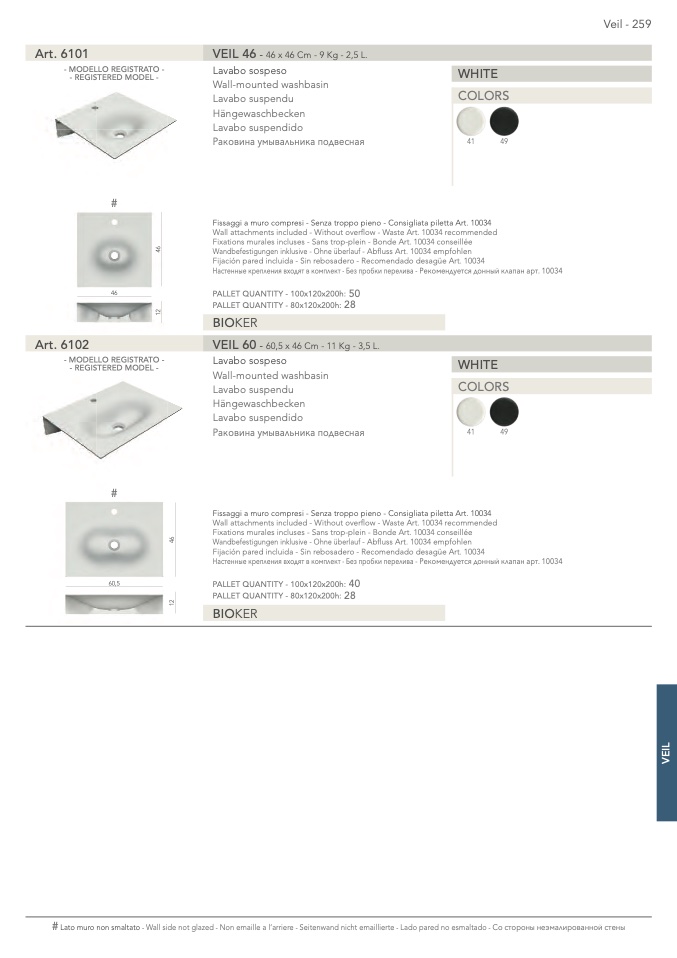 Fissaggi a muro compresi - Senza troppo pieno - Consigliata piletta Art. 10034