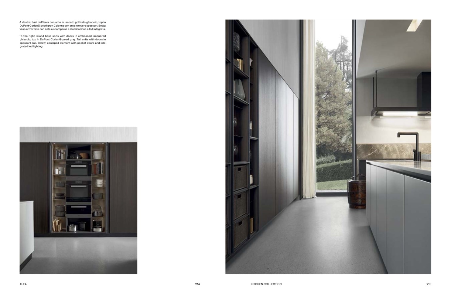 ghiaccio, top in DuPont Corian® pearl gray. Tall units with doors in