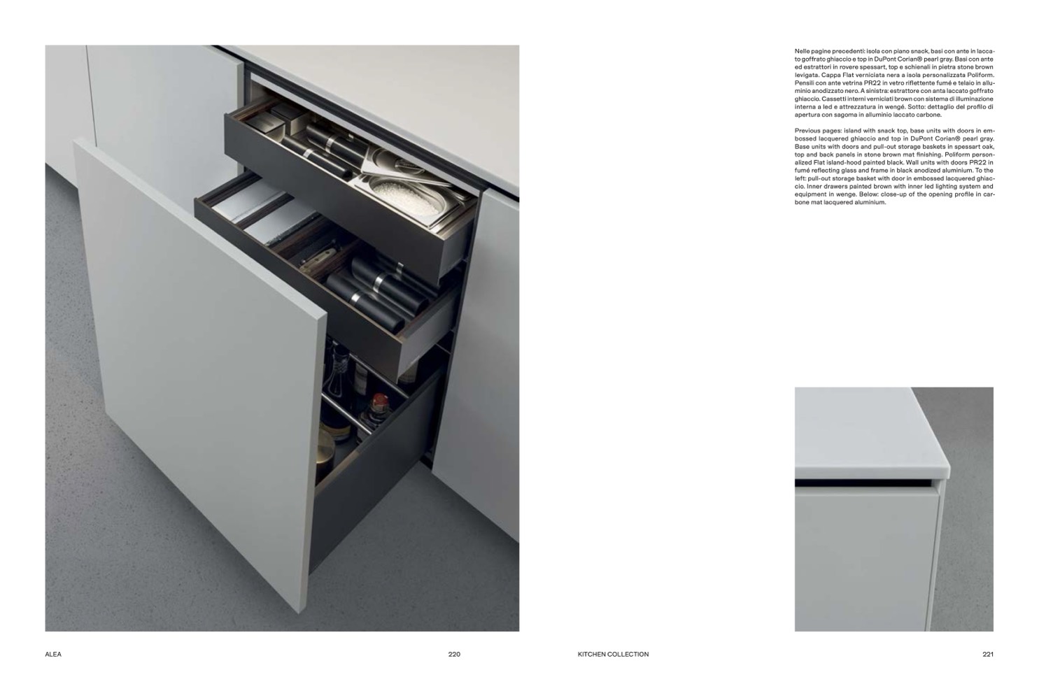 minio anodizzato nero. A sinistra: estrattore con anta laccato goffrato